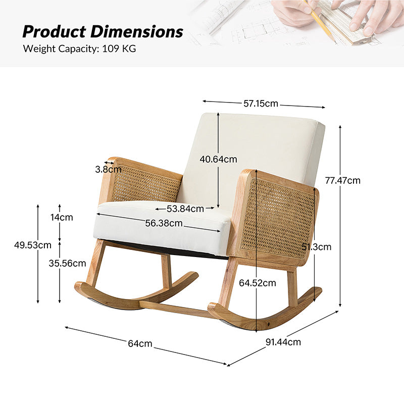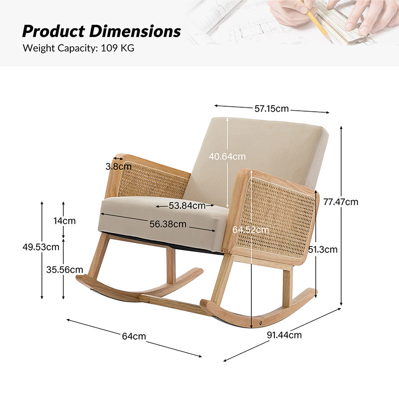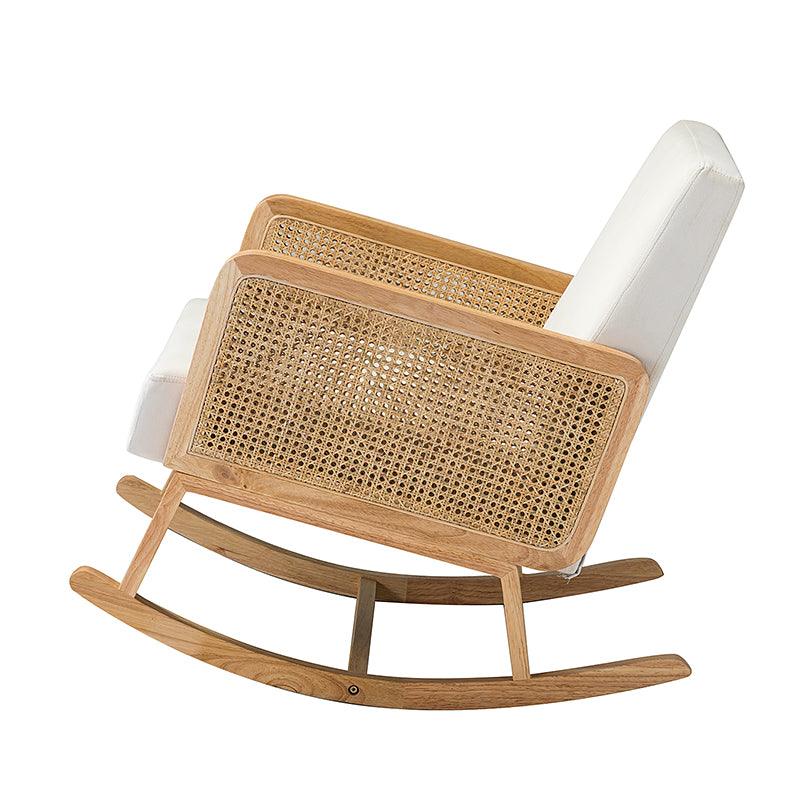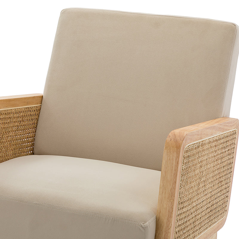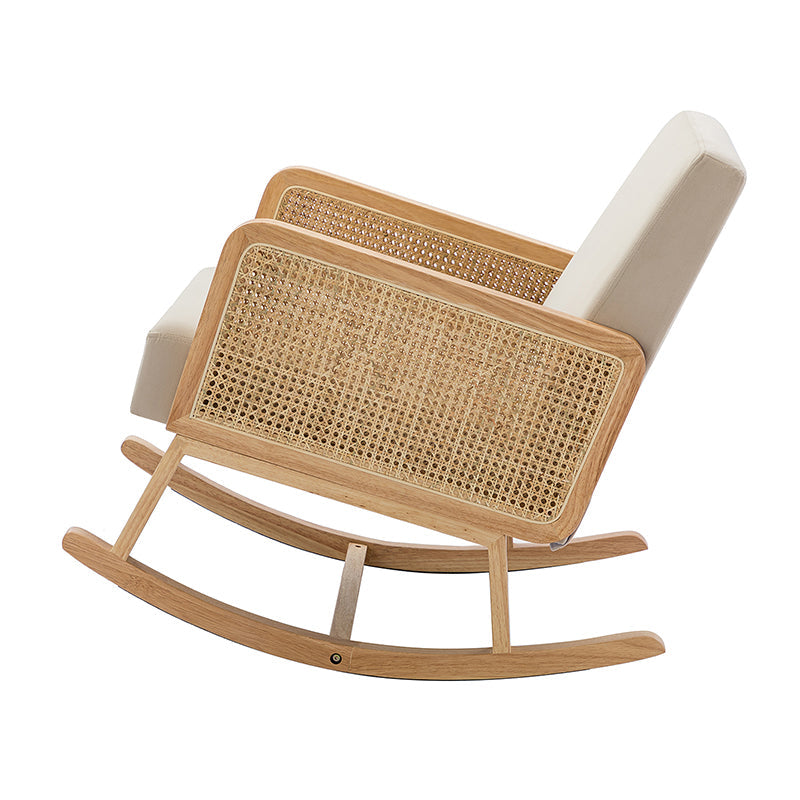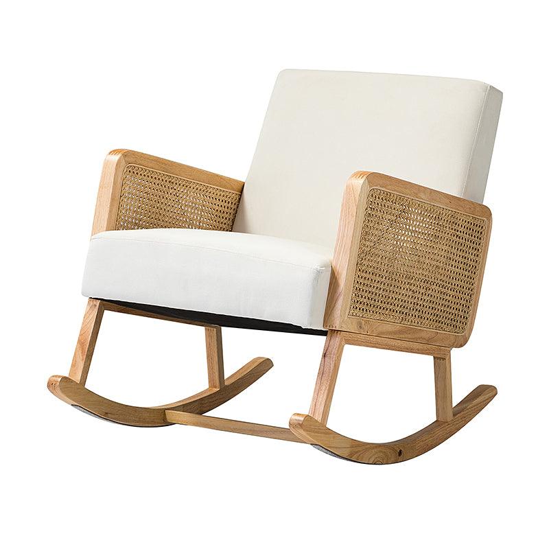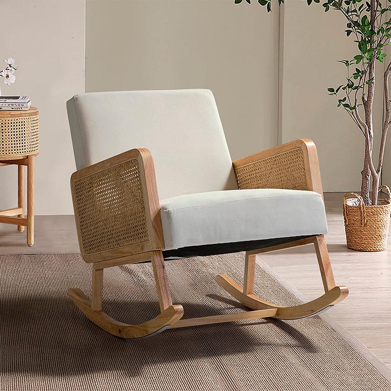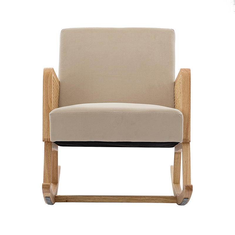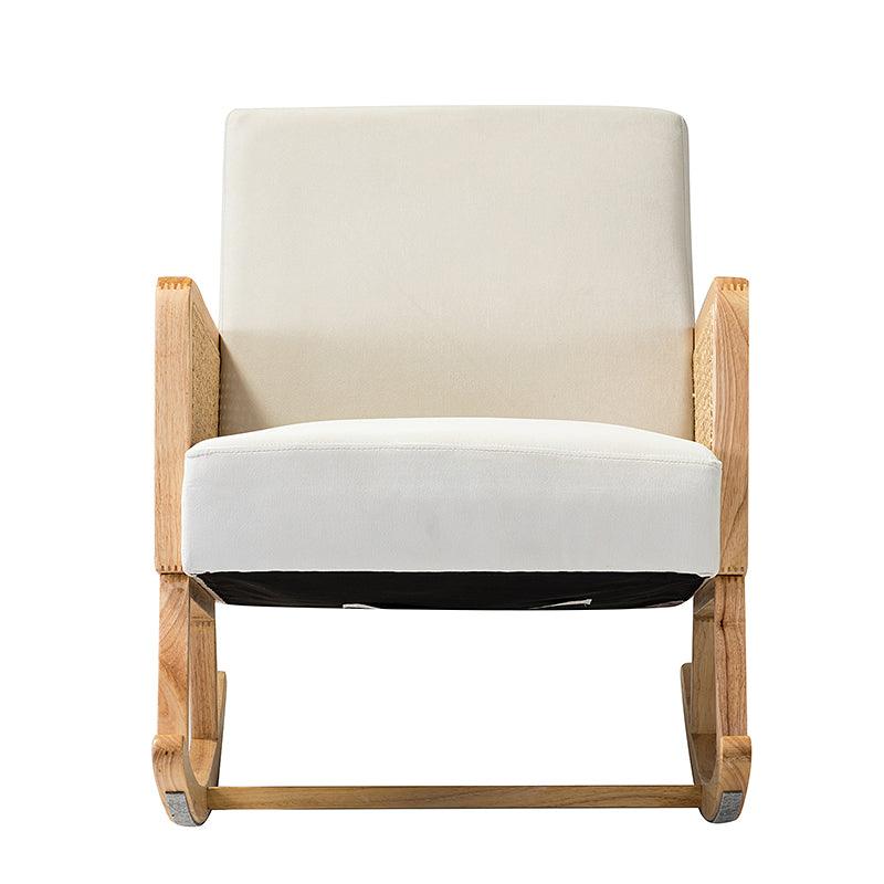 Sumérjase en una relajación hipnótica con esta silla de acento de estilo clásico y moderno. Con una estructura de madera maciza y manufacturada acabada en un tono glamuroso para una estabilidad y durabilidad perfectas, este diseño fiable es capaz de acompañarle durante mucho tiempo y compartir su felicidad en todo momento. El respaldo y el asiento acolchados con espuma de alta calidad están envueltos en una mezcla de poliéster texturizado opcional o en un tejido de terciopelo agradable al tacto con la piel que satisface sus diversas necesidades y proporciona el máximo confort. Sus brazos de madera maciza están adornados con elegantes elementos de ratán que le confieren una estética vanguardista. Aunque no disponga de mucho espacio, podrá deleitarse con su hipnótica relajación. Una mecedora moderna que se incorpora sin esfuerzo a cualquier rincón gracias a su modesto tamaño. Encaja en todos los escenarios sin esfuerzo, puede colocarla en el salón, el dormitorio, el balcón o en cualquier lugar donde desee disfrutar de una siesta perezosa o de un rato de ocio.
