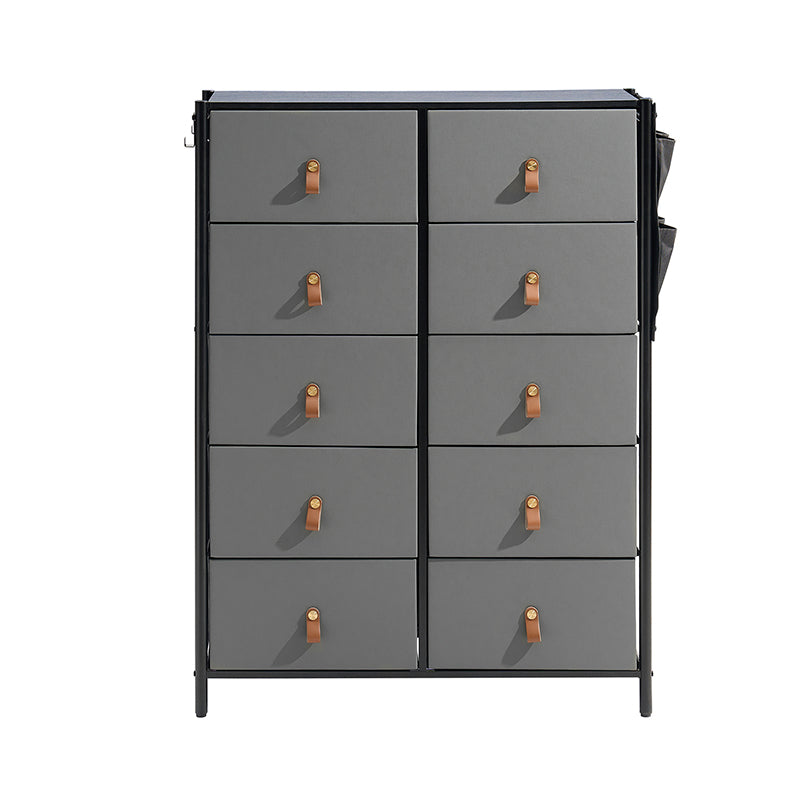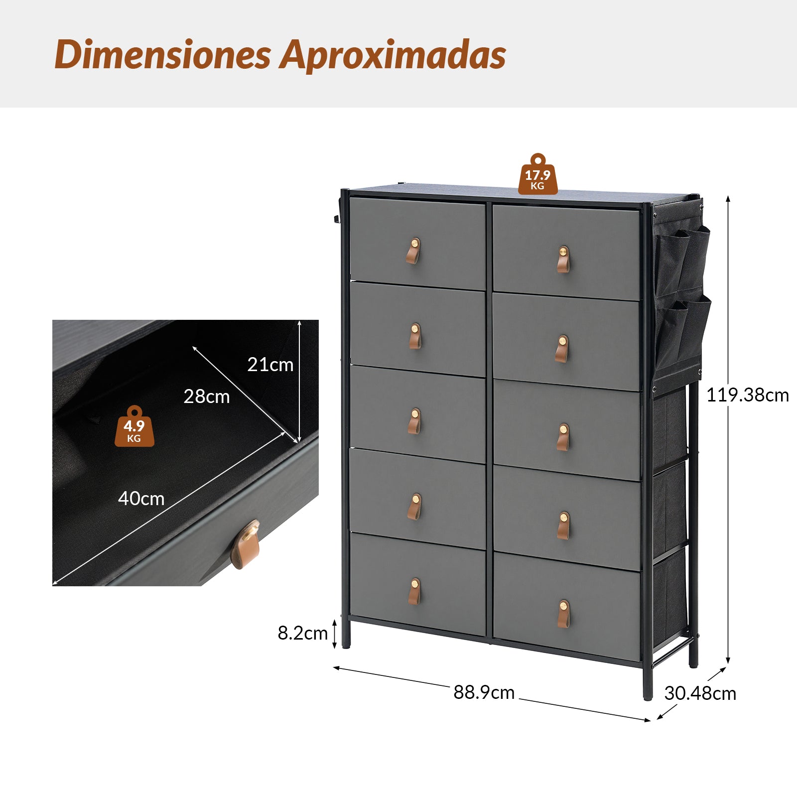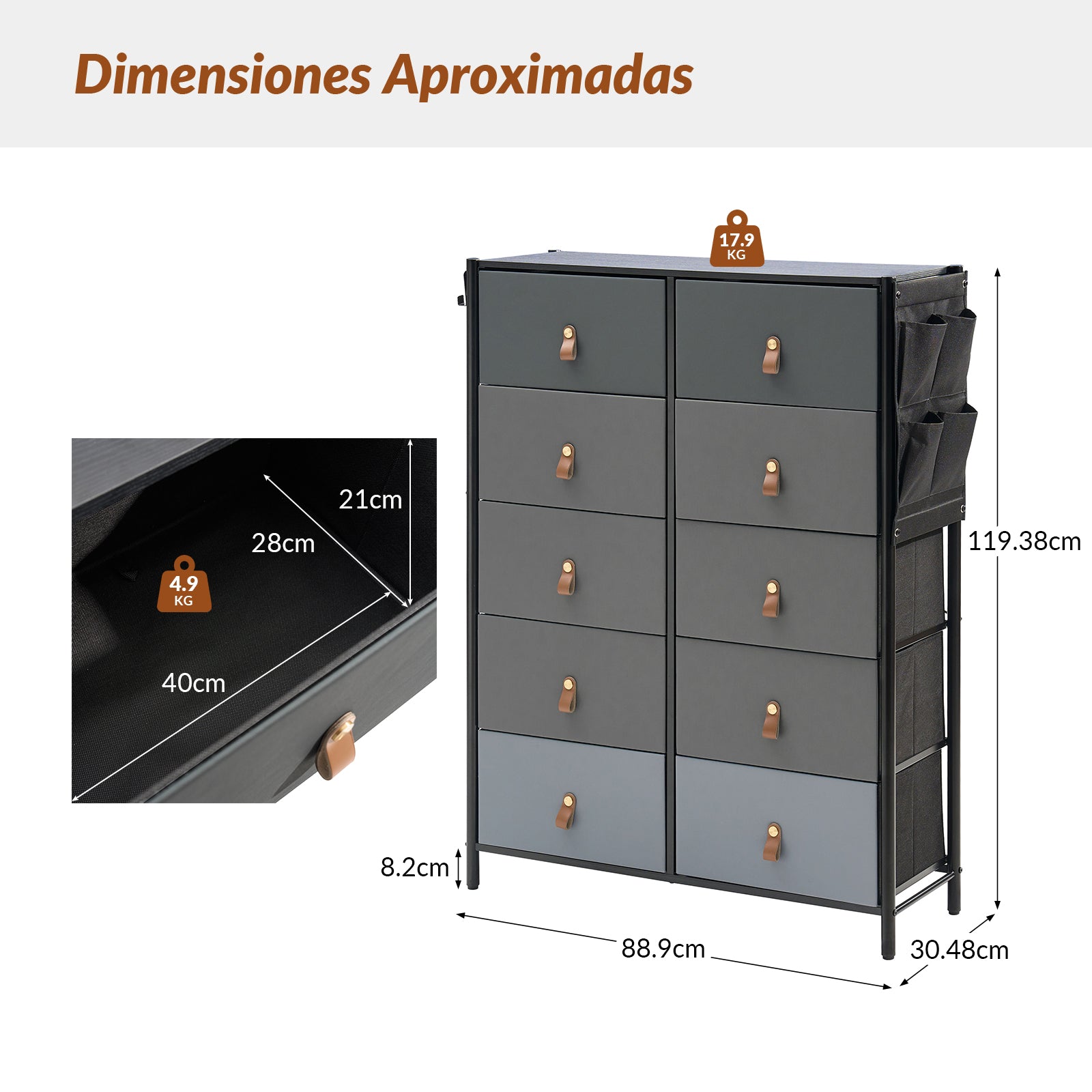 La cómoda de 10 cajones es una solución versátil y espaciosa para sus necesidades de almacenamiento. Con una gran capacidad, esta cómoda proporciona un amplio espacio para organizar sus pertenencias de manera eficiente. El dise?o de los cajones de tela elimina la necesidad de ruedas, garantizando un funcionamiento suave y sin complicaciones. Fabricada con una robusta y duradera estructura de acero, esta cómoda está hecha para durar y soportar el uso diario. El sencillo proceso de montaje le permite montarla rápidamente y sin esfuerzo, convirtiéndola en un cómodo complemento para cualquier habitación. Su diseño elegante y moderno lo hace adecuado para múltiples escenarios, ya sea que necesite almacenamiento adicional en su dormitorio, sala de estar u oficina en casa. La combinación de colores complementa varios estilos de interior, mejorando la organización de su hogar con esta cómoda de almacenamiento de 10 cajones y disfrutando de un entorno libre de desorden con facilidad.