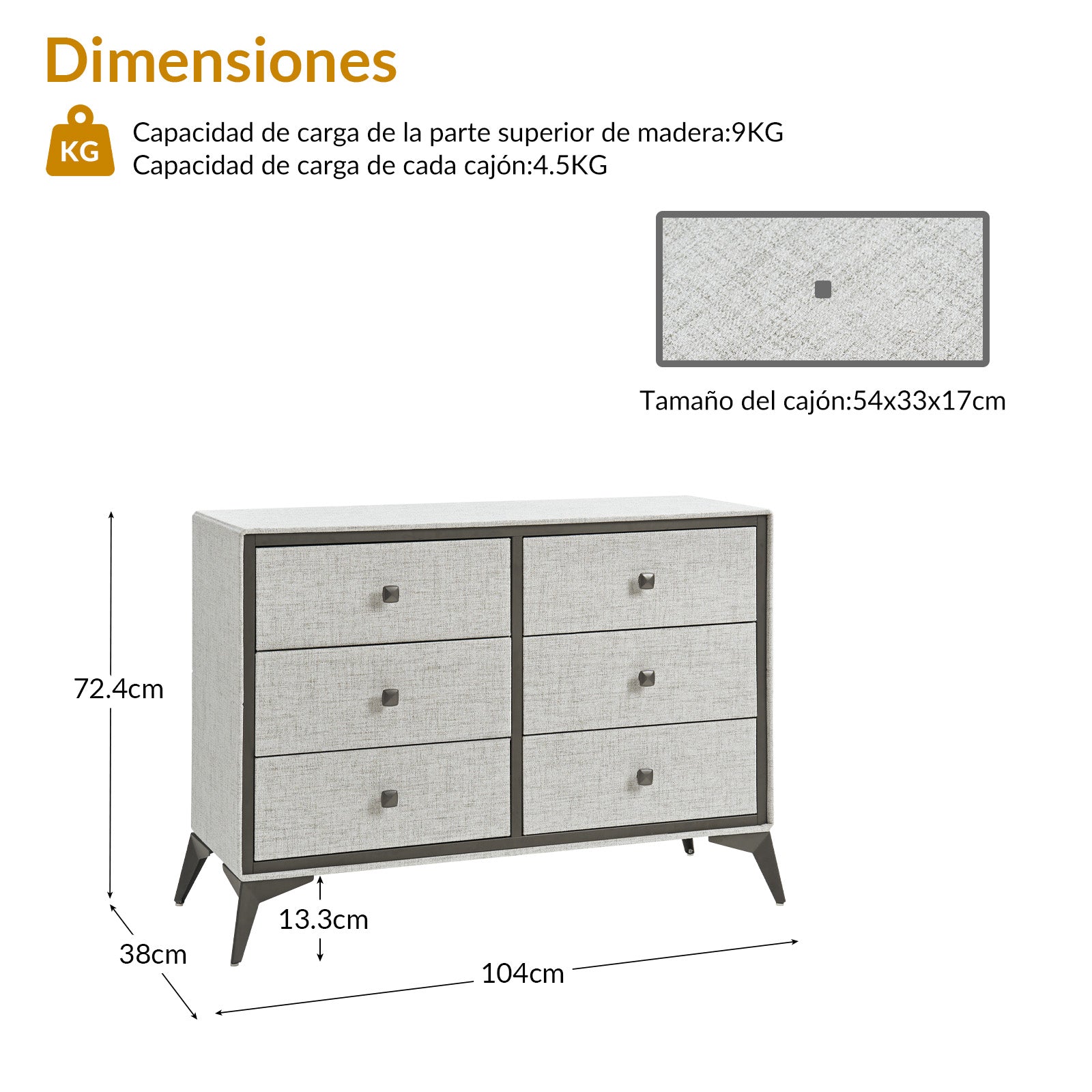 Esta cómoda ofrece un amplio espacio de almacenamiento con sus seis espaciosos cajones, lo que la hace idónea para organizar diversos objetos. Su diseño garantiza un fácil montaje, lo que le permite instalarla rápidamente sin complicaciones. Con cajones de tela, elimina la necesidad de ruedas, proporcionando un funcionamiento suave y silencioso. La robusta estructura de acero garantiza durabilidad y estabilidad, asegurando que la cómoda se mantenga fuerte incluso con un uso frecuente. Su dise?o versátil la hace adecuada para múltiples ambientes, ya sea en el dormitorio, el salón o la oficina. Esta cómoda combina funcionalidad y estilo, lo que la convierte en un excelente complemento para cualquier espacio que necesite soluciones de almacenamiento eficientes.